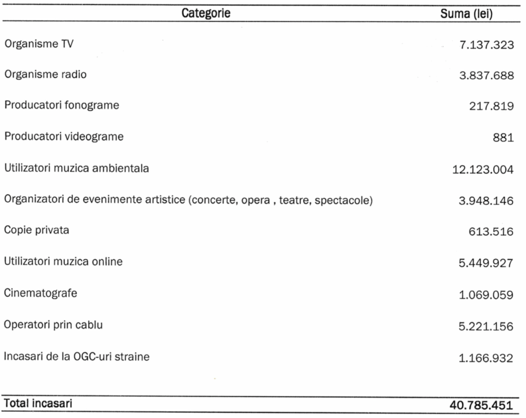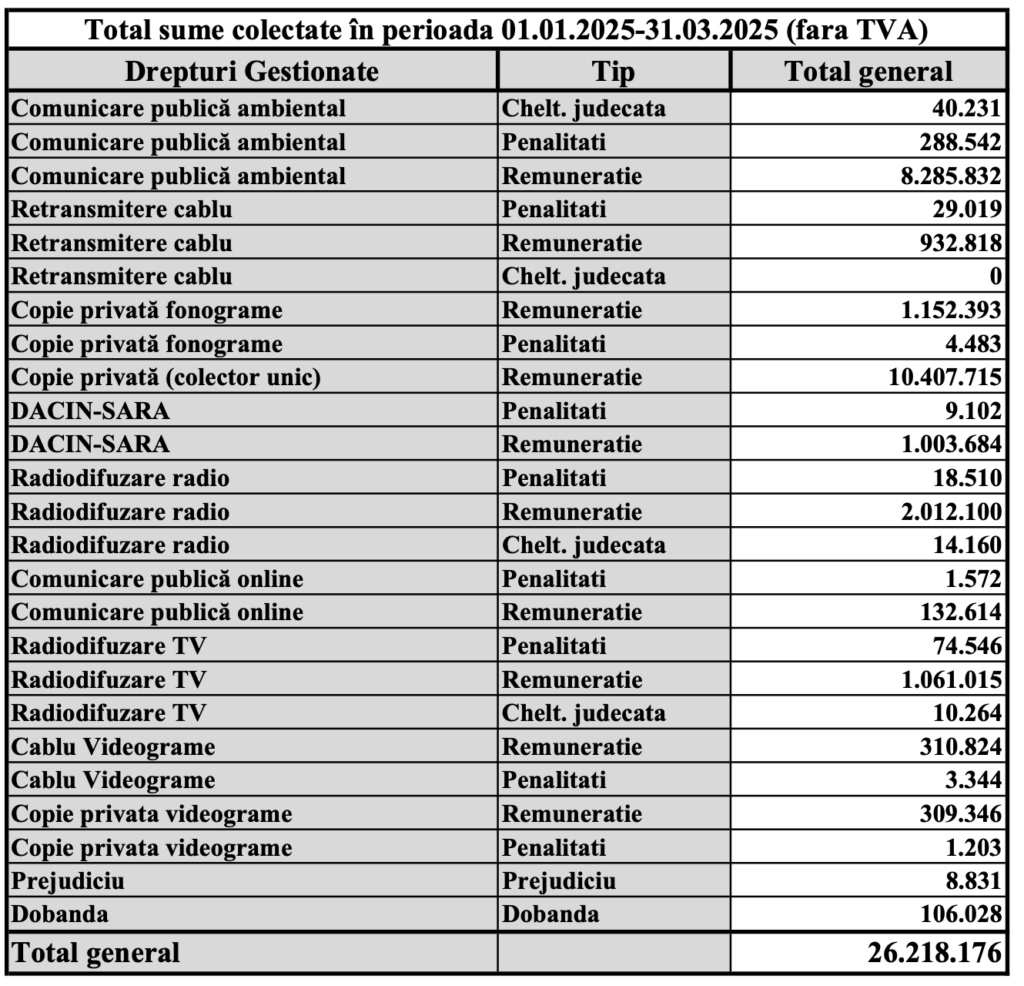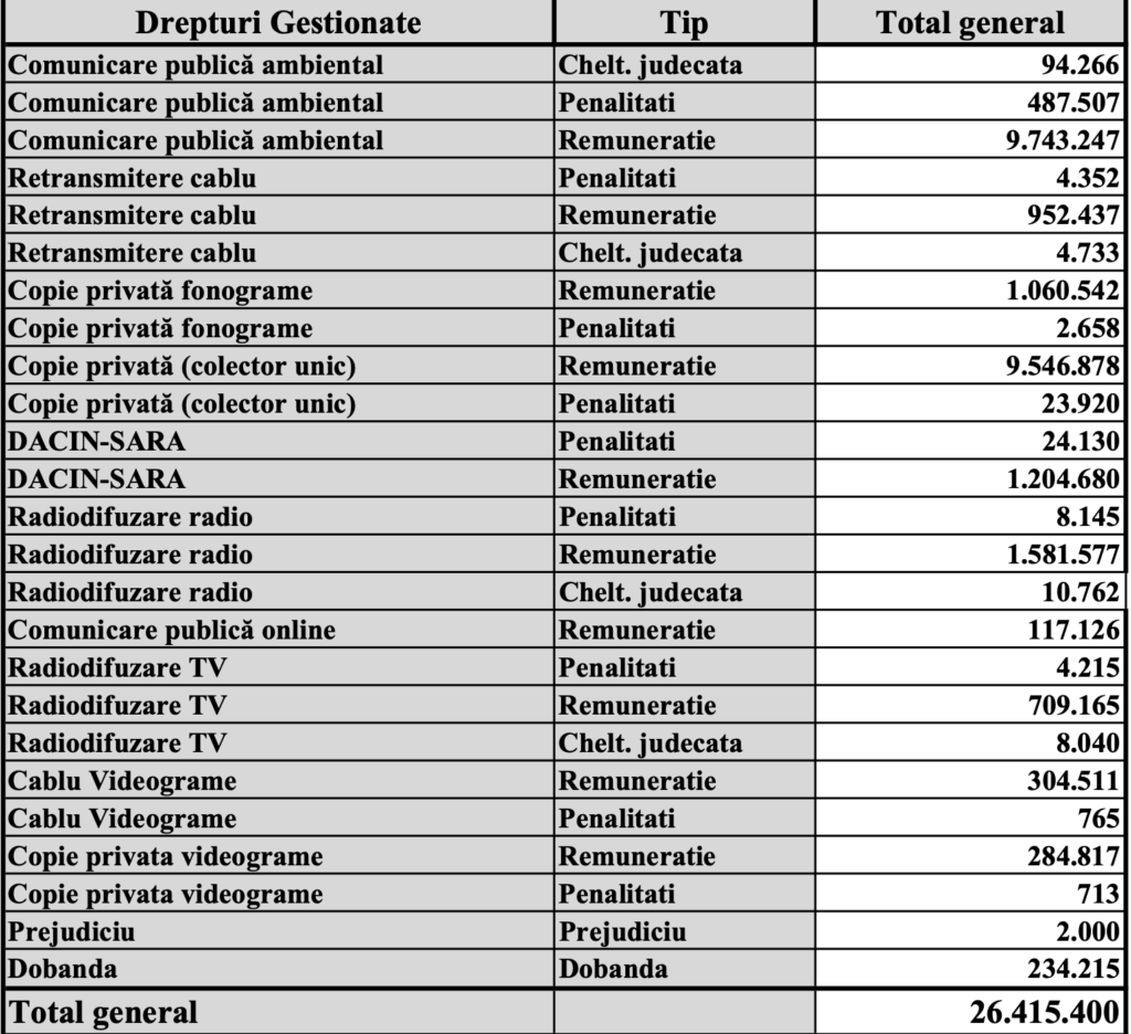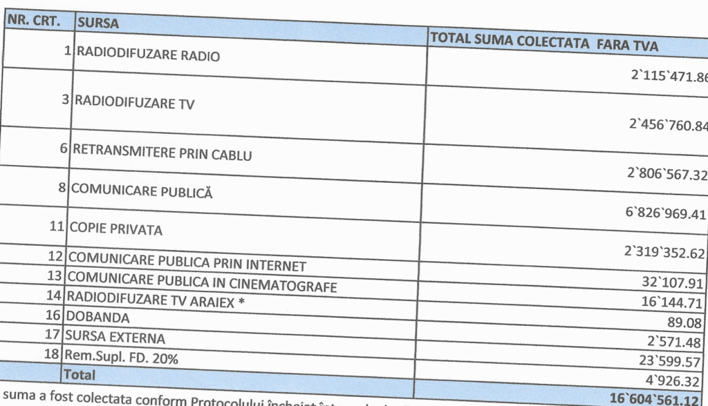 Conform Legii nr. 8/1996 privind dreptul de autor și drepturile conexe, organismele de gestiune colectivă au obligația să afișeze pe paginile lor de internet, până în ultima zi a primei luni ulterioare trimestrului de referință, sumele pe care le-au colectat, pe fiecare categorie de utilizatori.